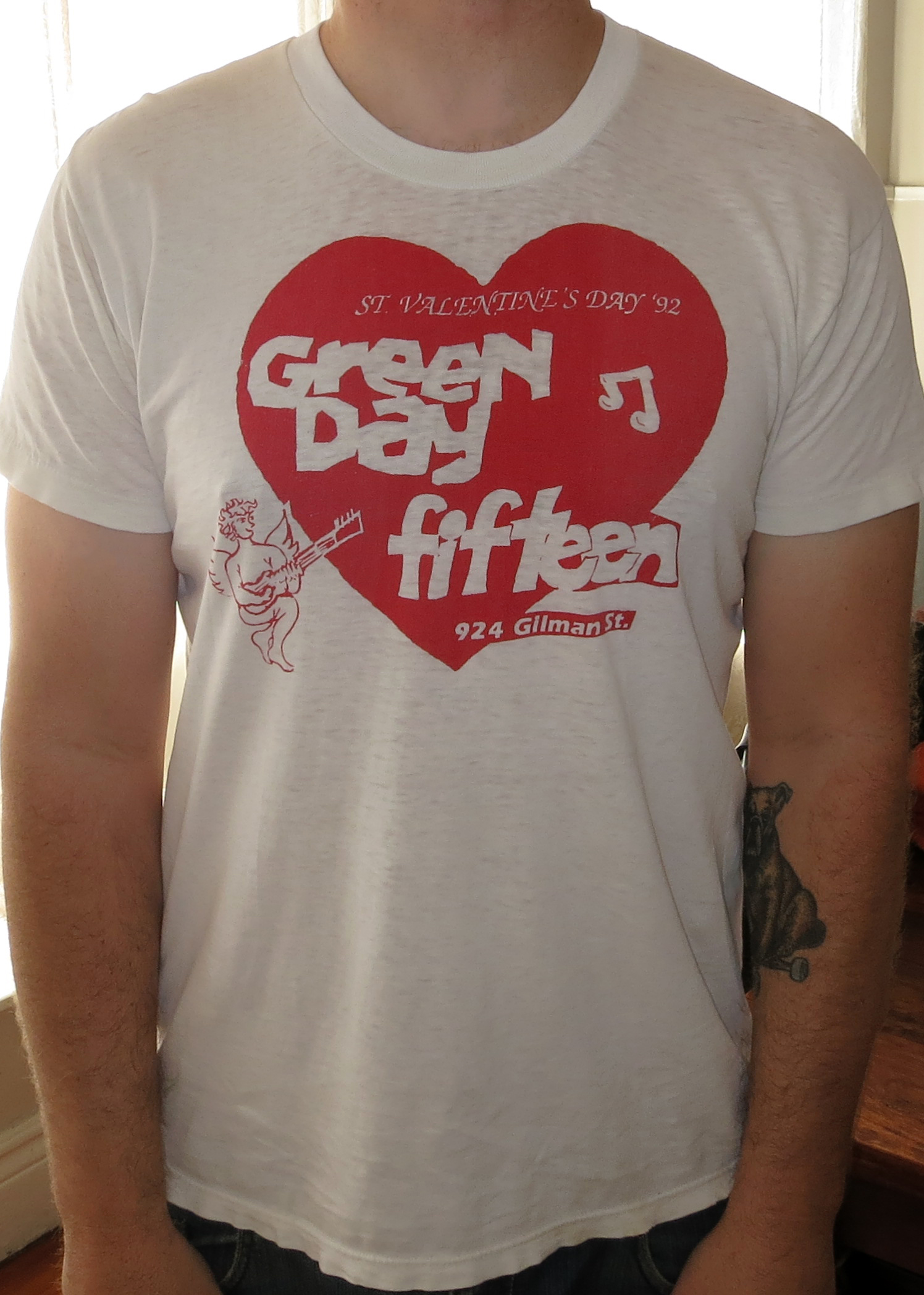 Je dirais que 75 % de ma collection vient des concerts. Et j’en achète quelques un sur eBay. J’essaie toujours de retrouver des T-shirts de concerts auxquels j’ai assisté et que j’ai eu mais qui ont disparu depuis. Par exemple, il y a quelques semaines, je portais ce T-shirt Green Day qui date d’un concert de la Saint-Valentin en 1992. Je me remémore parfaitement ce T-shirt, mais il était imprimé sur ces affreux T-shirts blancs que t’achètes en grande surface, par pack de trois. Le truc est tombé en lambeaux. J’en ai retrouvé un sur eBay alors je l’ai acheté. Ca m’arrive parfois de refaire un T-shirt qui n’existe plus ou qui coûte 500 $ sur eBay, comme ça je peux en avoir une copie.