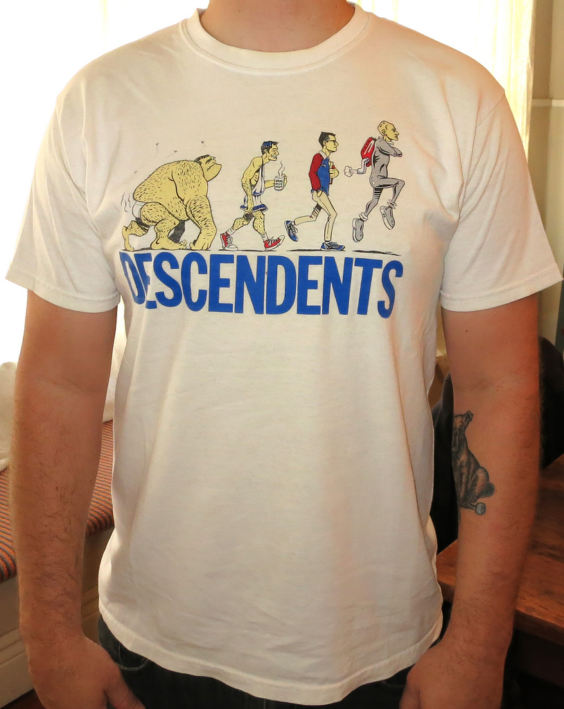 C’est sûrement un T-shirt des Descendents que j’avais commandé par correspondance. Je bossais pour une chaîne de frozen yogurt à Sacramento, je piquais de l’argent dans la caisse et je commandais plein de trucs. Oui, je suis un sale type. C’était le seul moyen que j’avais pour choper du merch à l’époque, à part bien sûr aller directement au concert. Donc je commandais plein de trucs sur des listes de VPC bizarres ou directement aux groupes. C’était un T-shirt de leur tournée de 1986. Je n’avais pas pu aller aux concerts mais j’ai quand même eu le T-shirt.
