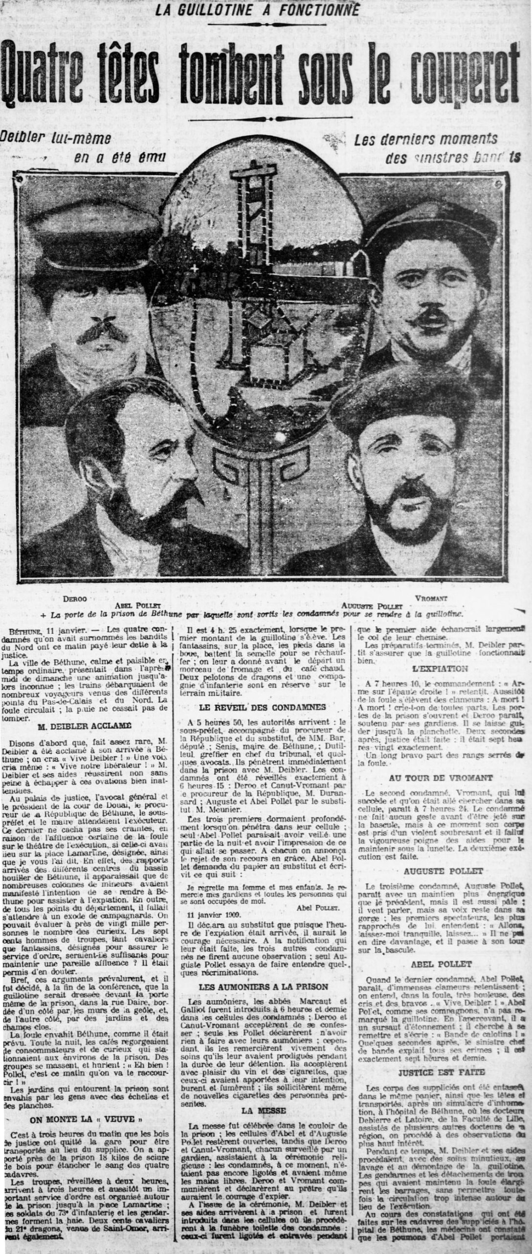 Extrait de « L’Ouest Éclair » en date du 12 janvier 1909, célébrant la quadruple exécution par la guillotine des membre de la bande à Pollet. Via Wikimedia Commons.