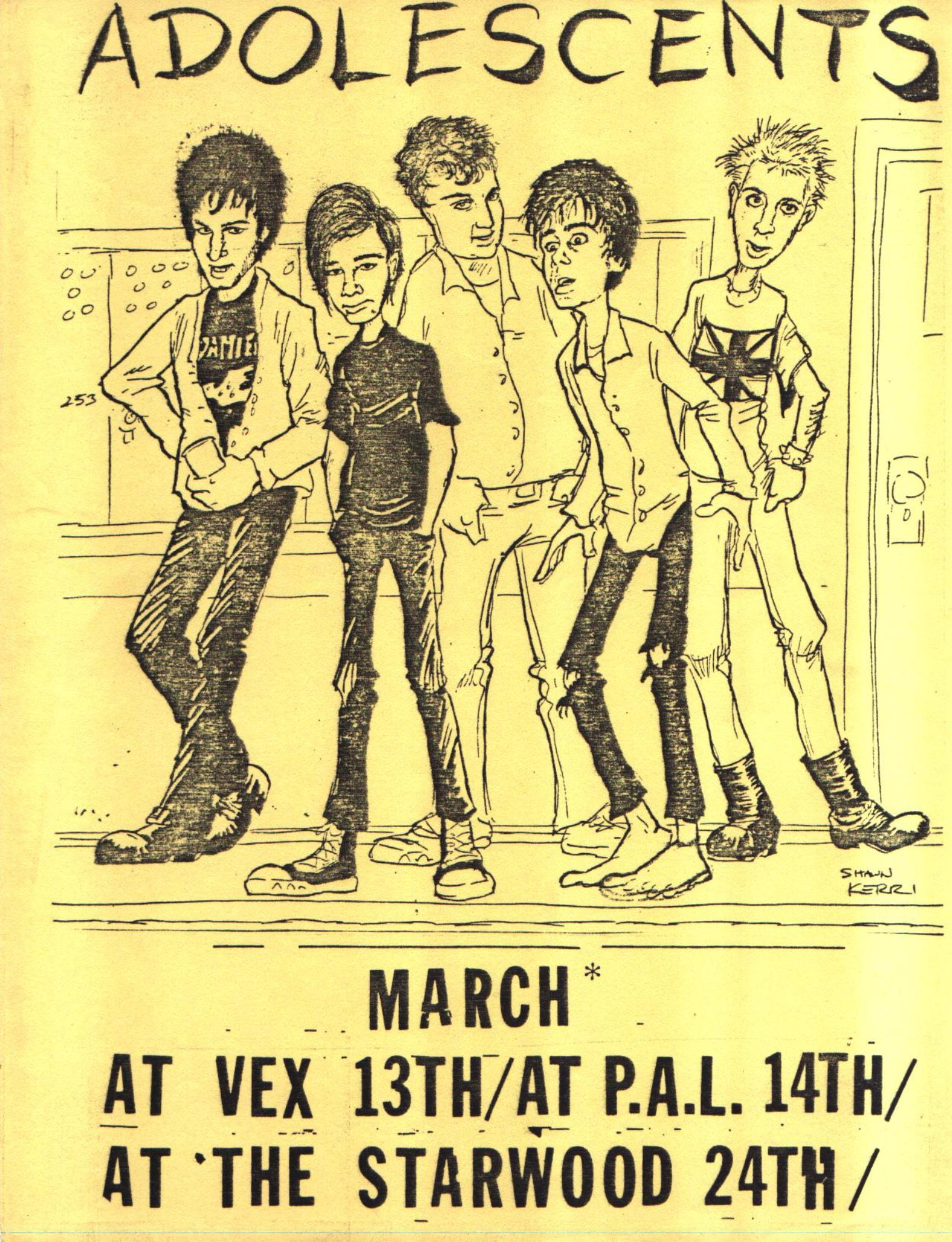 Comme c’est le cas pour Oki Dog, qui n’apparaît pas seulement dans les dessins de Kerri, mais dont il est très souvent fait mention dans les récits des acteurs de la scène de L.A. du début des années 80, les noms de certains clubs reviennent souvent sur le tapis, comme le Whiskey a Go-Go ou le Fleetwood. À travers les flyers dessinés par Kerri, et particulièrement les noms des clubs qui y apparaissent, on peut se faire une assez bonne idée de la géographie de la scène de la ville – que Noah Albert a reconstituée sur Google Maps. Hollywood est représenté par le Whiskey a Go-Go, le Starwood, le Monte Carlo et le Florentine Gardens ; Melrose par le Ukrainian Culture Center, Santa Monica par le Troubadour ; Redondo Beach par le Moose Lodge Hall et le Fleetwood ; San Pedro par le CSUN Campus North Ridge et le Dancing Waters. Tous ces noms représentent les lieux où se retrouvaient les kids, et là où le hardcore est né.