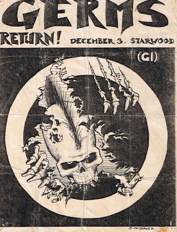 Certains des flyers de Kerri ornés de crânes sont « devenus des classiques à l’époque », comme elle le reconnaît. C’est particulièrement vrai pour le deuxième flyer qu’elle a dessiné pour les Germs, également connu sous le nom du « Retour des Germs » (voir ci-dessus), l’un des seuls qu’elle ait jamais commenté ; probablement parce qu’il a eu, selon elle « un certain impact sur les gens ». « Fais un flyer » sont les seuls mots que lui aurait lancé Darby Crash, leader des Germs, quelques semaines avant le concert. Pas têtue, elle leur avait donc dessiné un « squelette avec une crête, passant à travers un cercle bleu [ le logo du groupe ] ». Darby Crash s’était montré « anormalement excité » par le résultat qui, en vérité, le représentait lui, mort. « Le crâne, et la coupe de cheveux, c’était lui, sans aucun doute possible », affirme Kerri. L’excitation de Darby Crash avait perturbé Kerri, et sa mort par overdose quelques semaines plus tard ne fit qu’accentuer ce sentiment. Quand elle évoque l’intérêt de Crash pour son dessin, Kerri le qualifie de « très flippant », « comme pré-post-mortem », et se demande s’il pensait déjà au suicide avant qu’il ne le voit pour la première fois.