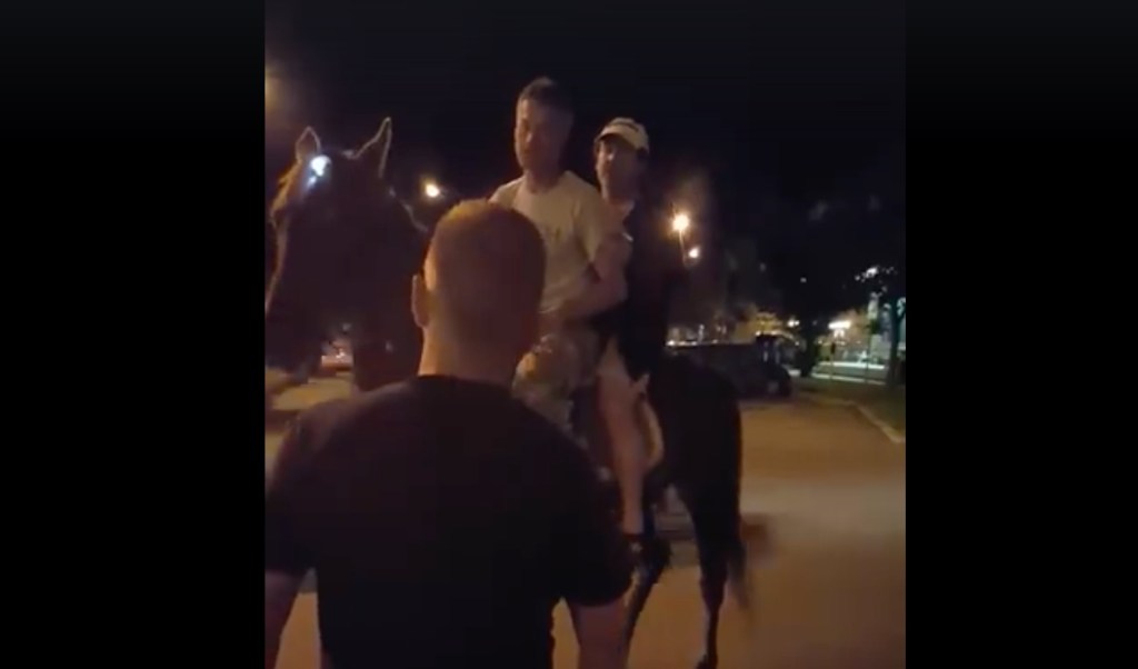Lorsque l’angle de la caméra change, on voit deux hommes assis ensemble sur un autre cheval, celui-ci équipé d’une lampe frontale. Est-ce qu’aller au bar à cheval est une tendance à Victo? Et la selle de ce deuxième cheval, est-elle vraiment assez grande pour deux bros?