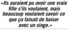 Bien sûr, ils venaient même exprès pour ça! Ils auraient pu avoir une vraie fille s’ils voulaient, mais beaucoup voulaient savoir ce que ça faisait de baiser avec un singe. Comme elle était rasée tous les deux jours, sa peau était très irritée et couverte de boutons. Elle se faisait dévorer par les moustiques, et les piqûres s’infectaient parce qu’elle se grattait tout le temps. Les clients la couvraient de bijoux, elle était vraiment hideuse.