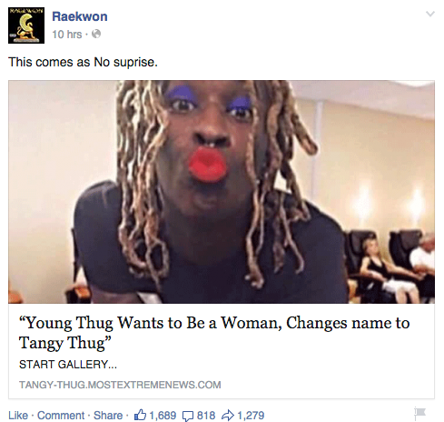 Jusqu’à maintenant, la stratégie pour les artistes de transformer leur page en agrégateur de contenus insolites pour élargir leur fanbase était plutôt maline (et efficace). L’exemple le plus criant en la matière reste Waka Flocka Flame qui continue à poster des liens infernaux de type « 7 trucs dégueulasses que vous ne saviez pas sur l’industrie du porno ». Cette tendance s’étend sur tout le paysage rap, de Raekwon à Curren$y en passant par Chief Keef, 50 Cent, Young Thug, etc. Même si ces listes ou articles à chiffres sont en général plutôt inoffensifs, la propension de ces pages à nous proposer de fausses infos a quelque chose de franchement effrayant.