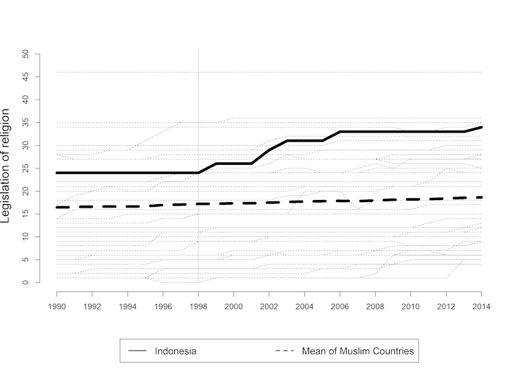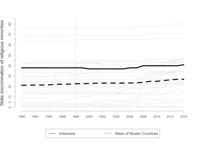 Banyak perubahan yang terjadi setelah Suharto jatuh pada Mei 1998 dan era Reformasi dimulai: sebagian positif, sebagian negatif. Menurut beberapa laporan, kebebasan beragama di era Reformasi lebih buruk dari era Suharto.Tapi apa benar demikian? Riset saya yang baru-baru ini dipublikasikan di Bulletin of Indonesian Economic Studies mencoba menjawab hal ini.Ada dua pertanyaan utama dalam riset itu. Pertama, bagaimana kebebasan beragama Indonesia dibandingkan negara mayoritas Muslim lain? Kedua, bagaimana kebebasan beragama Indonesia sekarang dibandingkan era Suharto?Analisis yang saya lakukan menemukan bahwa tingkat diskriminasi oleh negara, legislasi agama, dan diskriminasi sosial Indonesia adalah salah satu yang tertinggi di dunia Islam.Analisis saya juga menunjukkan bahwa kejatuhan Suharto memperburuk legislasi agama, yaitu pembentukan produk hukum yang mengatur kehidupan beragama, dan memperparah diskriminasi sosial terhadap pemeluk agama dan kepercayaan minoritas. Sementara, berakhirnya kekuasaan Suharto tidak berdampak pada diskriminasi yang dilakukan negara terhadap pemeluk agama dan kepercayaan minoritas.Dalam riset, saya menggunakan data dari Religion and State (RAS) Project Round 3 yang dilakukan oleh Jonathan Fox, profesor agama dan politik di Bar-Ilan University, Israel. Data ini bisa diunduh secara bebas di thearda.com/ras. Analisis saya mencakup 183 negara dari tahun 1990 sampai 2014.Ada banyak indikator kebebasan beragama di data ini. Saya fokus pada tiga indikator: diskriminasi negara (state discrimination), legislasi agama (religious legislation), dan diskriminasi sosial (societal discrimination).Diskriminasi negara terwujud dalam peraturan legal formal yang mendiskriminasi agama minoritas. Indikator yang digunakan antara lain ada tidaknya peraturan pemerintah yang melarang kegiatan ibadah agama minoritas, atau ada tidaknya peraturan pemerintah yang melarang pendirian rumah ibadah minoritas. Total ada 36 indikator diskriminasi negara yang saya analisis.Legislasi agama mengacu pada produk hukum yang tidak secara spesifik menyasar agama minoritas, tapi tetap bertujuan mengatur moral dan kehidupan beragama. Contoh indikator tentang legislasi agama adalah ada tidaknya aturan tentang penodaan agama, ada tidak aturan tentang pakaian perempuan, atau ada tidaknya aturan tentang homoseksualitas. Total ada 52 indikator untuk legislasi agama yang saya analisis.Terakhir, diskriminasi sosial mengukur bagaimana masyarakat itu sendiri mendiskriminasi agama minoritas. Fokus indikator ini adalah pada pembatasan yang dilakukan oleh masyarakat, bukan negara atau aparat pemerintah.Contoh indikator ini misalnya ada tidaknya perusakan tempat ibadah oleh organisasi kemasyarakatan (ormas) atau ada tidaknya pelarangan ibadah oleh ormas. Total ada 27 indikator diskriminasi sosial yang saya analisis.Pada tiga grafik berikut, saya menampilkan hasil analisis. Pada setiap grafik, sumbu horizontal x menampilkan tahun dan sumbu vertikal y menampilkan nilai atau skor di masing-masing dimensi yang disebutkan di atas.Di tiap grafik, garis tebal tidak putus-putus menunjukkan angka Indonesia, garis tebal putus-putus menunjukkan angka rata-rata negara Muslim, dan setiap garis tipis mewakili satu negara Muslim. Dari tiga grafik ini terlihat jelas tingkat diskriminasi negara, legislasi agama, dan diskriminasi sosial Indonesia lebih tinggi dibanding banyak negara Muslim.Di dunia Islam, kita salah satu yang paling membatasi kelompok agama minoritas. Mengingat betapa sering elit dan masyarakat kita mengaku toleran, barangkali sudah saatnya kita berhenti mengaku toleran dan mulai belajar untuk benar-benar bersikap toleran.