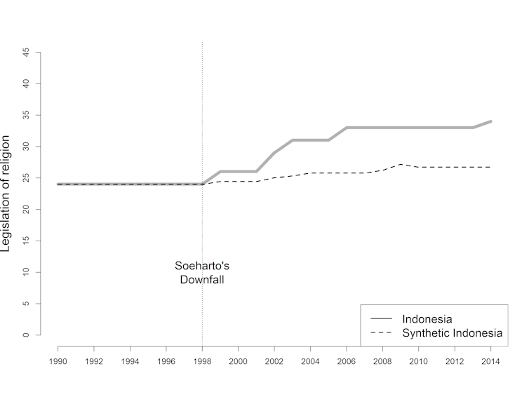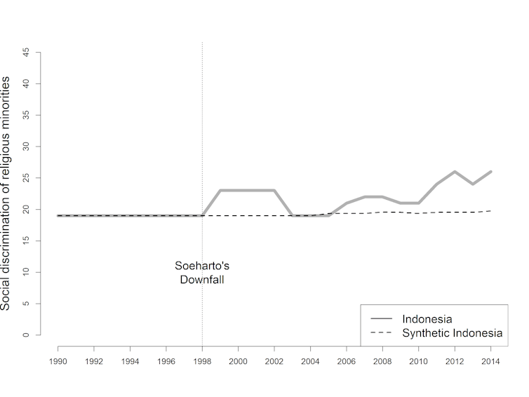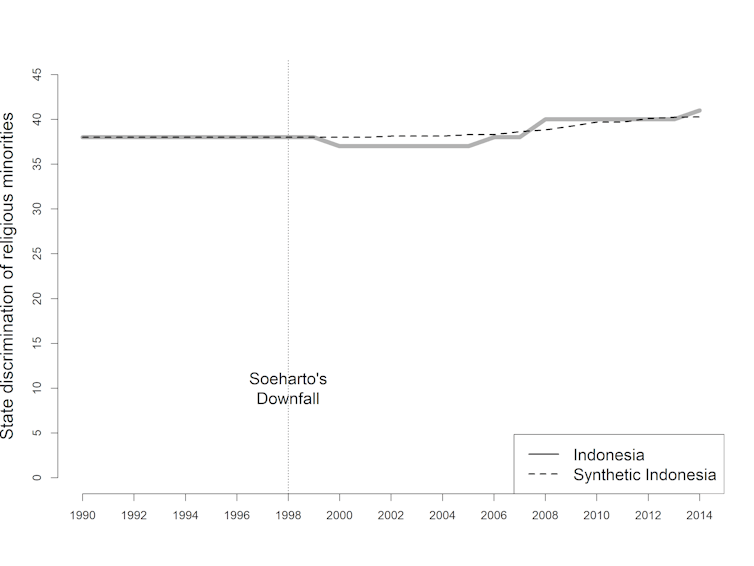 Apakah kebebasan beragama sekarang lebih buruk dibanding era Suharto? Apakah reformasi memperburuk kebebasan beragama?Untuk menjawab pertanyaan ini saya menggunakan teknik Synthetic Control Method. Metode ini membandingkan Indonesia sekarang dengan “Indonesia” sintetik atau imajiner yang masih diperintah Suharto. Indonesia sintetik ini dibuat dengan menggabungkan negara-negara lain berdasarkan kriteria tertentu seperti Produk Domestik Bruto (PDB) per kapita, persentase populasi urban, tingkat keragaman agama, dan tingkat demokrasi.Saya membandingkan Indonesia aktual atau Indonesia yang sebenarnya dengan Indonesia sintetik (Indonesia yang tidak mengalami kejatuhan Suharto). Perbedaan antara keduanya ada pada perkiraan efek kejatuhan Suharto terhadap kebebasan beragama.Terkait diskriminasi negara, tidak ada beda antara Indonesia aktual dengan Indonesia sintetik. Kebebasan beragama di Indonesia sekarang tidak berbeda dengan situasi jika Suharto masih berkuasa. Legislasi agama dan diskriminasi sosial justru meningkat jauh. Kejatuhan Suharto memperburuk dua hal ini.