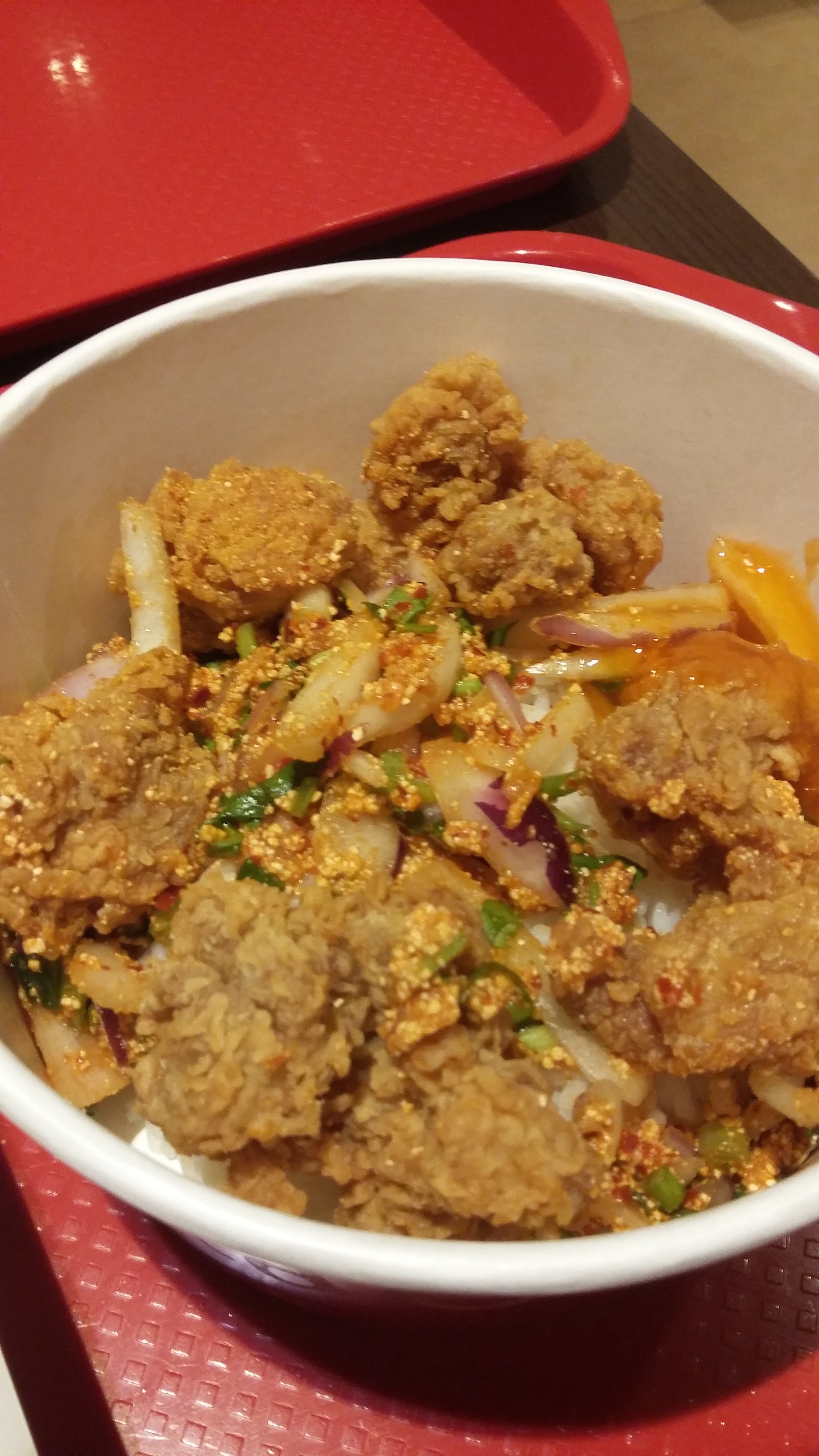 Nugget dalam Spicy Chicken Rice Bowl yang disajikan KFC setempat ditaruh di atas jasmine rice dan dibumbui ketumbar, daun bawang dan cabai merah. Daging panggan versi KFC setempat juga ditambahi jamur jelly putih. Tuntaskan dengan kue tar susu manis yang sedapnya tak terkira dan kamupun bakal mencicipi apa yang mungkin disajikan oleh Colonel Sanders saat berlibur menghabiskan cutinya di Asia Tenggara.