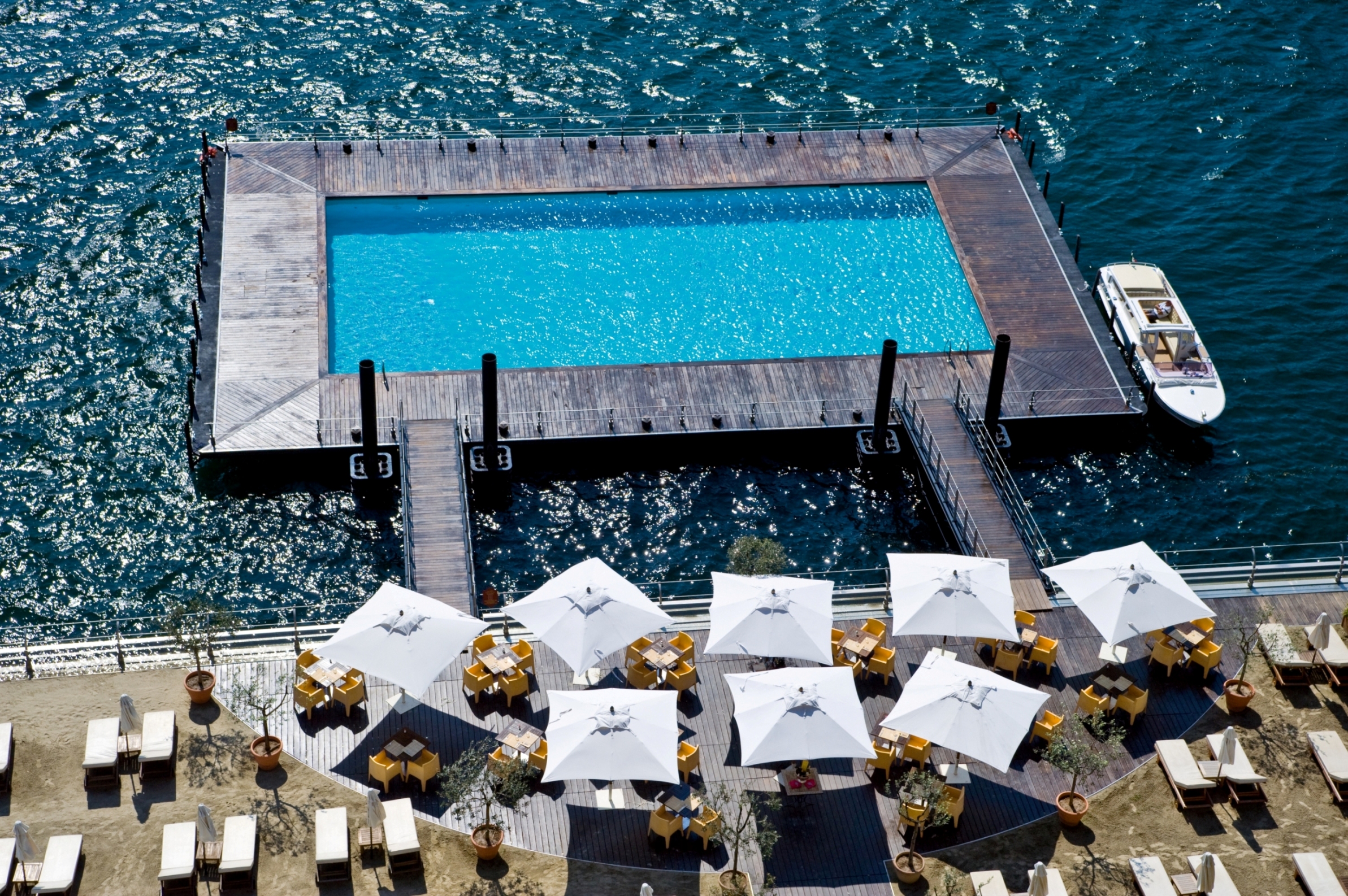 Jika cuaca sedang bersahabat, anda bisa memanjakan diri, berenang di kolam renang hotel yang benar-benar melayang di atas Danau Como. puaskan mata anda untuk memandangi panorama pegunungan Alpen yang megah. Kalaupun anda tak sempat berenang, jepret saja pemandangan ini. Percayalah fotonya bisa bikin instragram anda naik kelas.