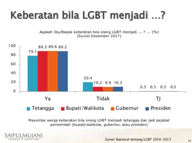 Sebagian besar masyarakat Indonesia memiliki pandangan negatif terhadap kelompok Lesbian, Gay, Biseksual, Transgender, dan Queer (LGBTQ). Sebagian lainnya malah menganggap komunitas LGBTQ sebagai ancaman. Itulah kesimpulan hasil survei dari Saiful Mujani Research and Consulting (SMRC) yang dirilis 25 Januari lalu. Survei nasional tersebut dilakukan pada Maret 2016, September 2017, dan Desember 2017, merekam betapa isu LGBTQ kini bukan lagi soal menjamin hak sipil individu, tapi merambah ranah politis.