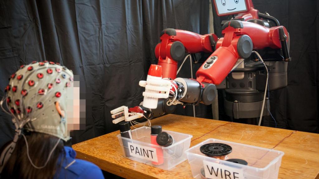 Dalam suatu percobaan, sebuah robot bernama “Baxter” buatan Rethink Robotic diberi tugas sederhana: memisahkan cat dan kabel dalam dua kotak yang sudah diberi tanda. Saban lengan Baxter mengarah pada kotak yang salah—asal kalian tahu, Baxter tak bisa membedakan cat dan kabel yang sedang dipegangnya—seorang manusia yang ikut dalam percobaan tersebut bisa mengirimkan sinyal gelombak otak untuk bilang “Hei Baxter kamu salah tuh!” dengan menggunakan EEG monitor pada Baxter (yang bakal merona bila kedapatan melakukan kesalahan). Algoritma yang digunakan para peniliti memungkinkan Baxter bisa memahami sinyal gelombak tersebut dengan mudah dalam hitungan 10-30 milisecond. Hasilnya Baxter tak jadi melakukan kesalahan. Wah!