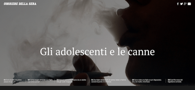 Sulla scia del dibattito “giovani e droghe in Italia”—costellato da editoriali su adolescenti “dentro una nuvola di spinelli” e “guide ai genitori“—Il Corriere della Sera ha deciso di dedicare uno speciale al tema. Si intitola “Gli adolescenti e le canne“, e racchiude una serie di pezzi già pubblicati in passato, che vengono riproposti in gruppo proprio adesso e che letti uno di fila all’altro mi hanno gettato in un profondo stato di angoscia. Non tanto per i giovani e le canne, ma per l’ennesima dimostrazione del livello del dibattito sulle droghe leggere in Italia.