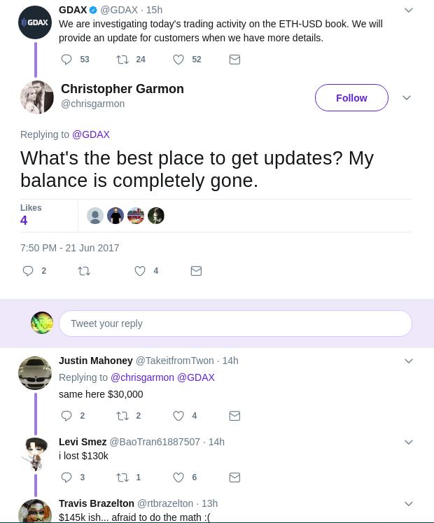 Comprensibilmente, essendo state perse grosse somme di denaro (e in alcuni casi guadagnate) in un batter d’occhio, in molti si stanno chiedendo chi abbia effettuato la prima vendita che ha poi innescato il processo, per capire sopratutto se si è tratta di una manipolazione del mercato. Il post sul blog di GDAX afferma che sarà condotta una “indagine approfondita” per far luce sugli eventi, ma nel frattempo la comunità di trading della criptovaluta cercherà risposte ovunque. Alcune vittime dell’evento hanno già incominciato a organizzarsi attraverso dei gruppi Telegram, con l’intenzione di portare avanti una class action contro la borsa, ma al momento la posizione di GDAX spiega che tutti gli scambi di margin trading sono definitivi, e che i termini erano stati stabiliti in precedenza.