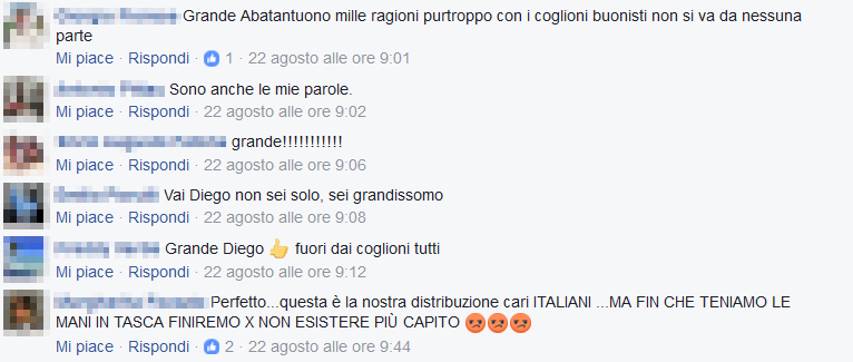 Il secondo elemento che mi ha portato a sgomberare il campo dai dubbi è il tenore dei commenti sotto al video. Certo, magari qualcuno scherza; eppure, molti elogiano Abantantuono (“Diego sei il numero 1, hai detto tutta la verità” o “Grande Diego premier subito”) o lo invitano a candidarsi (“Diego fai un movimento anti islam contro i falsi buonisti”). Altri sostengono che “questi messaggi oltre che da condividere su facebook andrebbero portati in strada. Oramai è tardi, in Italia c’è una popolazione di fede musulmana di oltre due milioni, pertanto con Facebook ci si fa ben poco.”