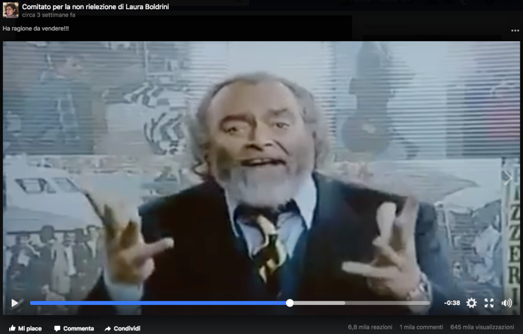 Mentre scrivo, la clip ha quasi 700mila visualizzazione e oltre 24mila condivisioni. A postarlo è stata la pagina “Comitato per la non rielezione di Laura Boldrini,” che l’ha accompagnato con lo status “Ha ragione da vendere!!!”