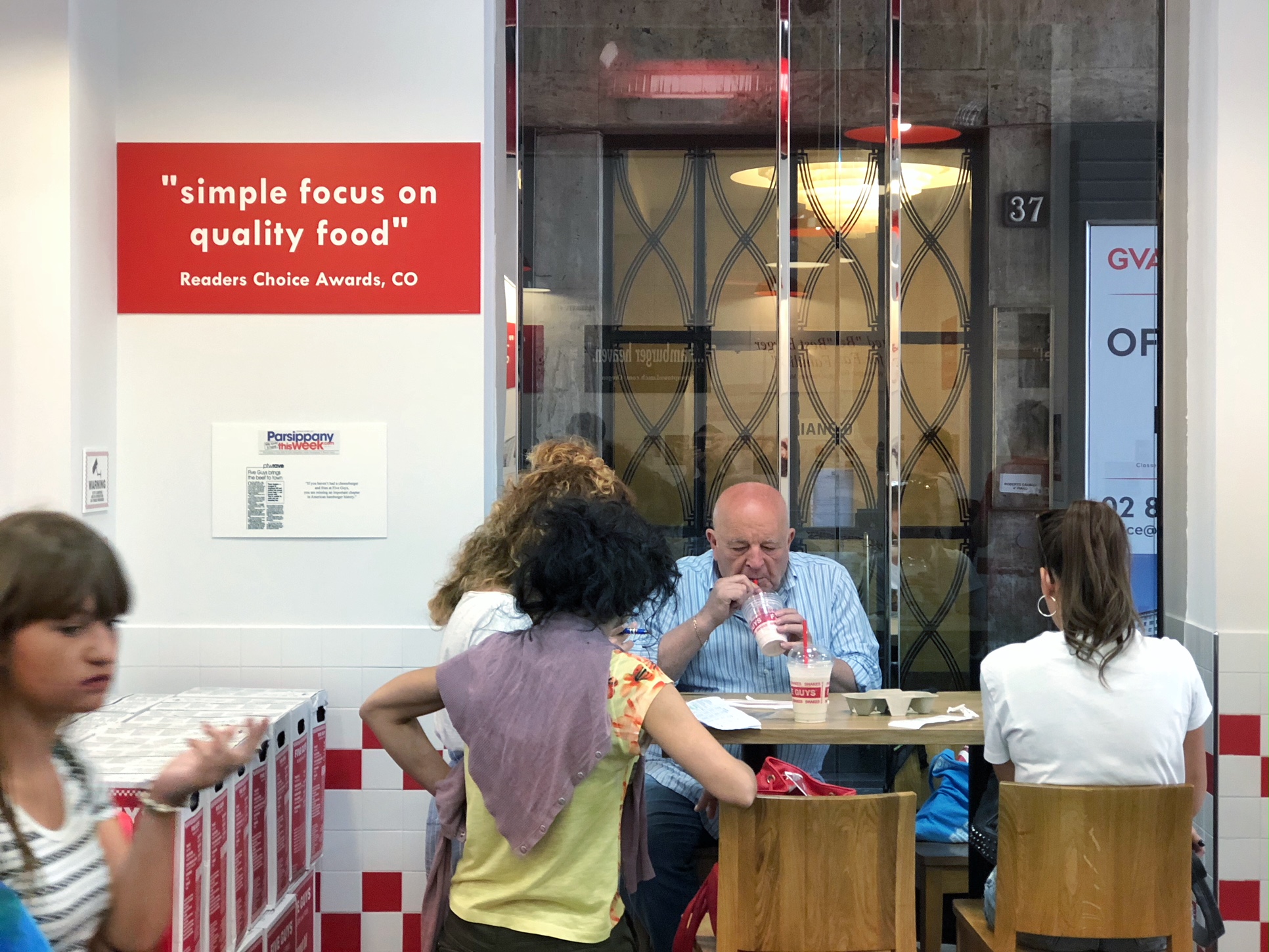 Quello che fa la catena di fast food americana è in pratica ciò che si era perso di vista in tutta l’euforia da #hamburgermania. Buoni ingredienti, niente freezer per garantire la freschezza assoluta di carne e patate, cucina ampiamente in vista, patate a km quasi zero, olio di arachidi. E una brand image in controcorrente con i competitor: font ritenuti unanimemente brutti (come il Tekton Bold, simile al Comic Sans), cartelli con frasi ad effetto di magazine internazionali, piastrelle bianche e rosse e pack ridotto all’osso. Panini avvolti nella stagnola, patatine contenute in bicchieri di carta, un sacchetto privo di stampe color tabacco a contenere il tutto e bicchieroni lunghi e capienti per le bibite ricaricabili.