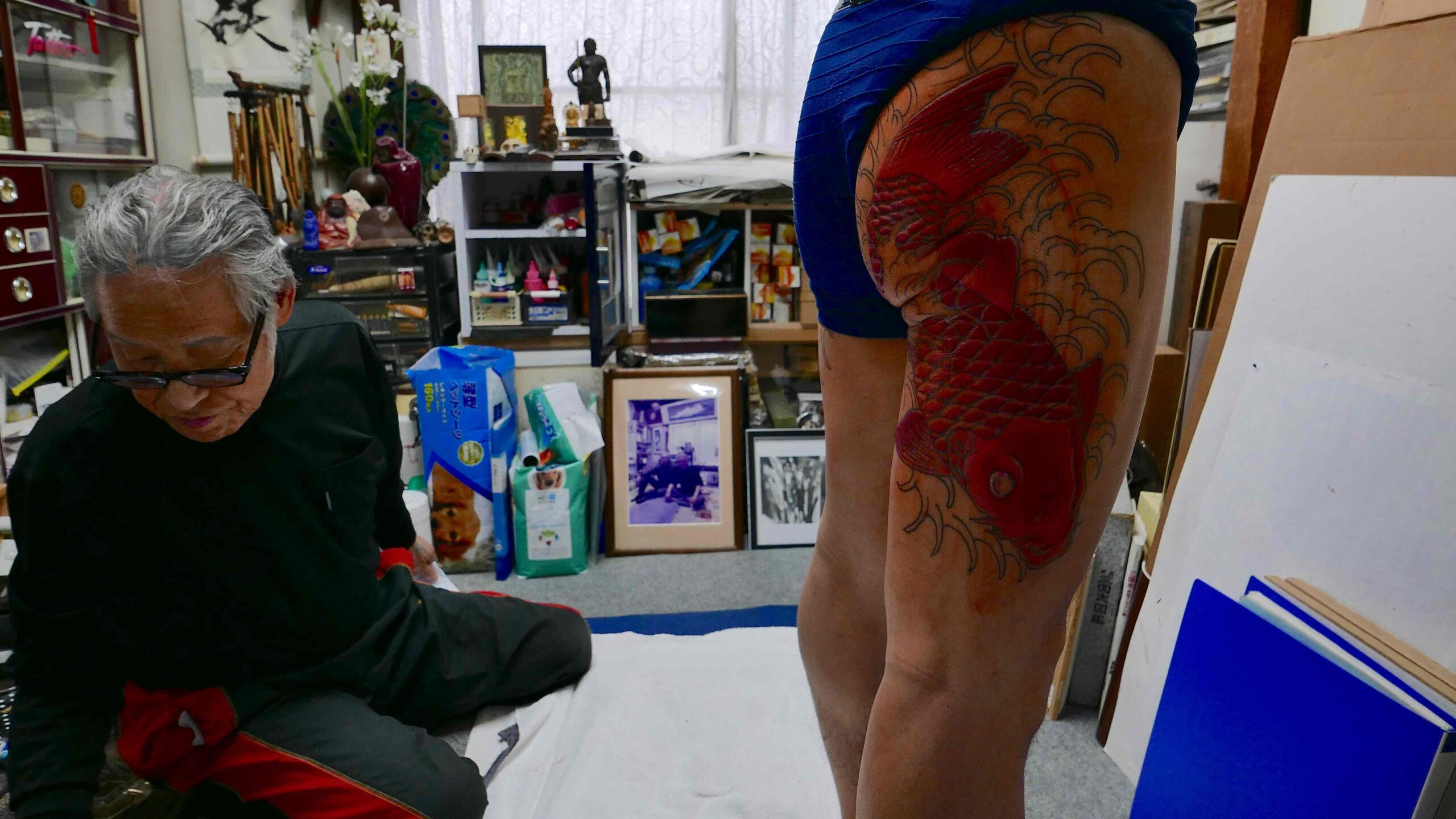 I due uomini all’ingresso facevano parte di una famiglia della Yakuza. Horiyoshi stava tatuando una carpa koi sulla pelle del loro capo, un uomo anziano che indossava una tuta della Champion. Mi hanno offerto una sigaretta e con una certa ansia ho chiesto loro se dovessi andare fuori a fumarla. Il ronzio dell’ago di Horiyoshi si è fermato all’improvviso, come se lui si stesse svegliando da un sogno lucido. “Tranquillo, stai qui e fuma,” mi ha detto.