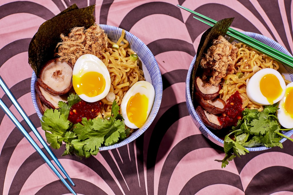 5. Adesso prendi una ciotola grande, versaci dentro i noodles freddi e aggiungi il condimento con il miso, più tutti i semini di sesamo e le cipolline. Dividi quindi per 4 portate, guarnendo ognuna con i funghi, l’alga nori, il rou song e il sambal. Taglia le uova per il lungo: ogni ciotola di noodles freddi dev’essere completata con 2 metà!