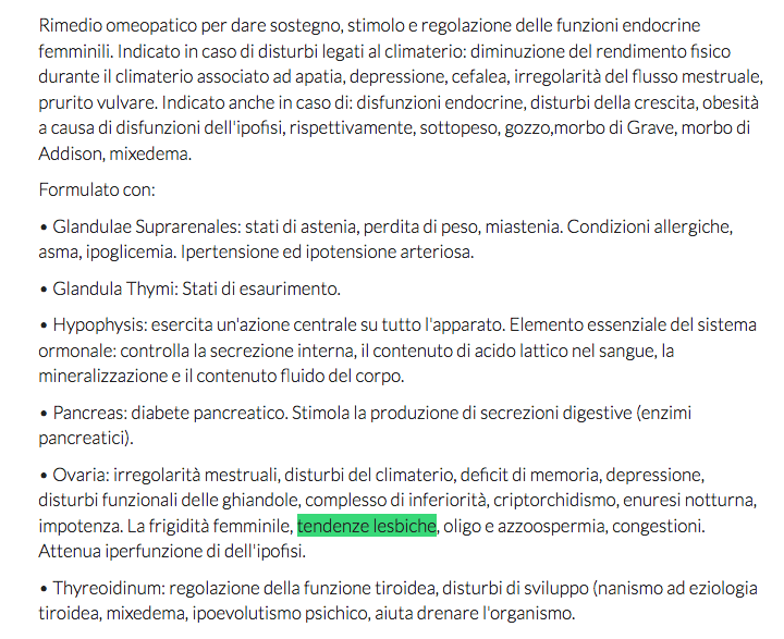 A questi “rimedi” di dubbio gusto e dubbi risultati, da qualche settimana si aggiunge il rimedio che per eccellenza è tutto dubbio e niente risultati: l’omeopatia. Come segnalato da Butac, sul sito di una farmacia autorizzato dal Ministero della Sanità è infatti in vendita un “rimedio omeopatico per dare sostegno, stimolo e regolazione delle funzioni endocrine femminili” che conta tra i suoi componenti l’Ovaria, indicata per il trattamento di “frigidità femminile, tendenze lesbiche, oligo e azzoospermia, congestioni.” [Dopo le segnalazioni in massa e gli appelli rivolti a Beatrice Lorenzin molti siti che vendono il prodotto hanno rimosso il riferimento alle “tendenze lesbiche,” ancora visibile nella cache di alcune pagine].