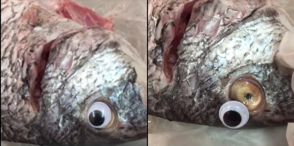Nella seconda clip si vede anche una donna che, con un dito coperto dalla gomma del guanto, stacca l’occhio finto rivelando al mondo il suo vero, incavato e ingiallito bulbo oculare. Secondo quanto ha riportato il Gulf News, se un pesce ha un occhio giallo e incavato è vecchio almeno di due giorni, e di sicuro è tutto meno che fresco.