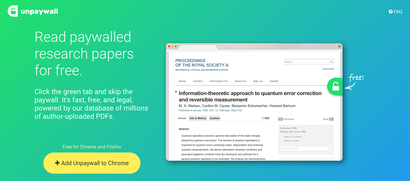 Un’estensione appena uscita del browser Chrome, chiamata Unpaywall e creata dal sito open-source Impactstory, vuole contrastare nel modo più legale possibile questo fenomeno, offrendo agli internauti uno strumento per trovare rapidamente (e gratuitamente) i testi di ricerche pubblicate su siti a pagamento.