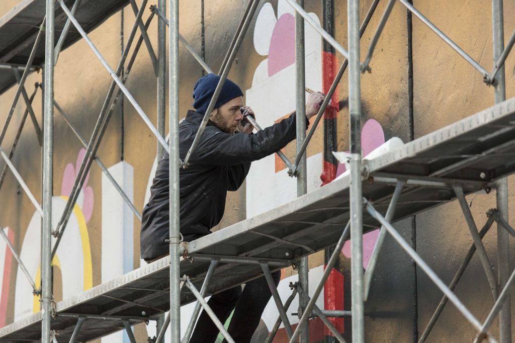普段は電動式シザーリフトを使って作品を描くと伺いましたが、今回は足場を組んでの作業ということで、来る前に心配されていたと聞いていますが。