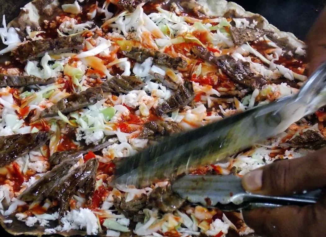 「普通のトラユーダには、キャベツや、赤トマト、ラディッシュなんかは入っていない。本物のオアハカ・トラユーダは、アシエント、豆、フレッシュチーズ、そして肉だけ」と彼は説明する。しかし彼は、メキシコシティ住民の舌に合わせて、味を調整している。唐辛子ジュースでつくられた赤いソースの中に、プラスチックのスプーンを手際よく入れては、ソースがコーントルティーヤの上にらせん状に広がるよう、外側から内側に向けてとろりとさせながら広げていた。