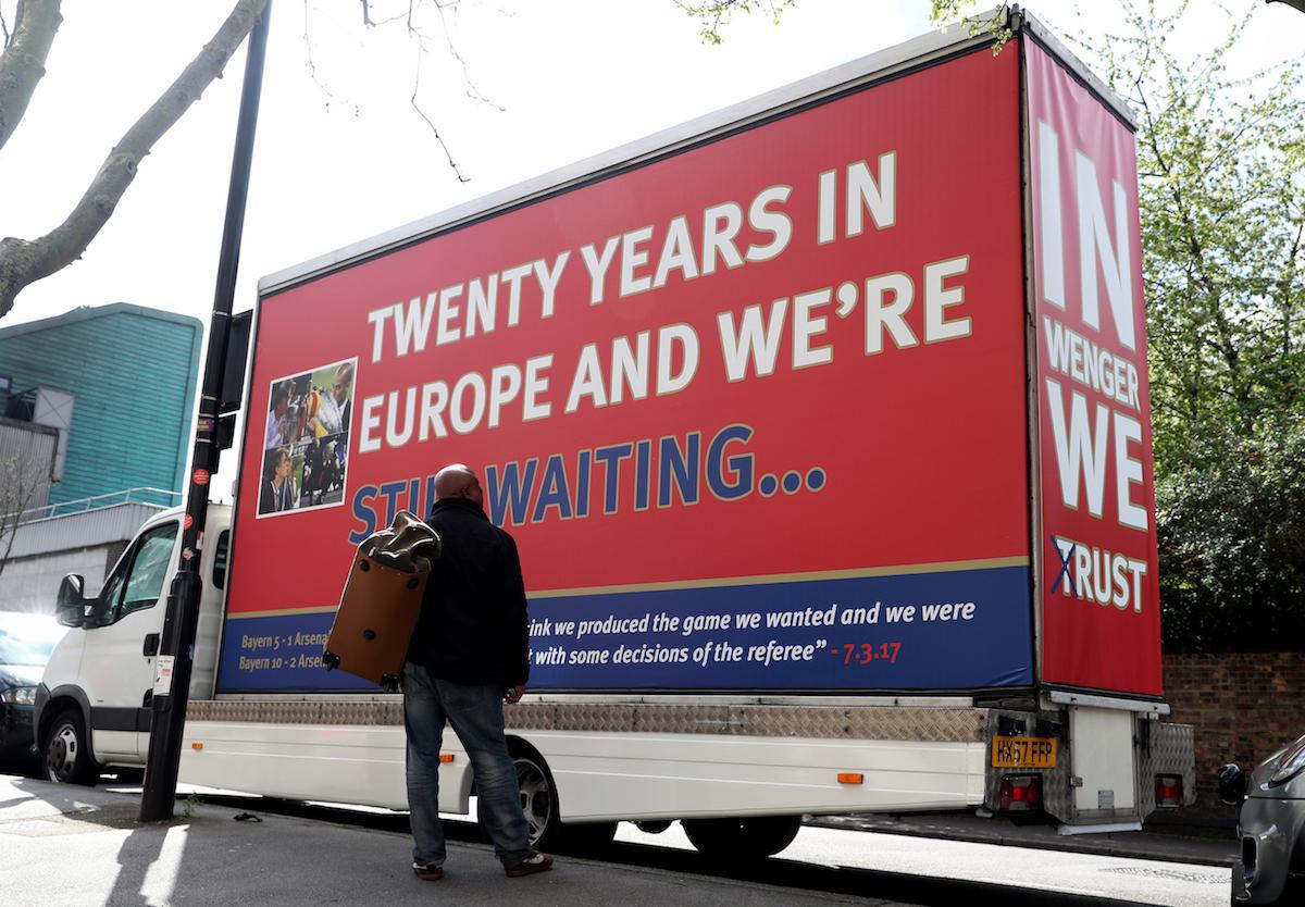 Verder heeft iemand heeft zijn zuurverdiende geld uitgegeven aan een busje dat is volgekalkt met anti-Wenger teksten, wat sterk doet denken aan de bedrukte auto’s van Nigel Farage. Op het anti-Wengerbusje staat: ‘Twenty years in Europe and we’re still waiting’ en ‘In Wenger we Trust’.
