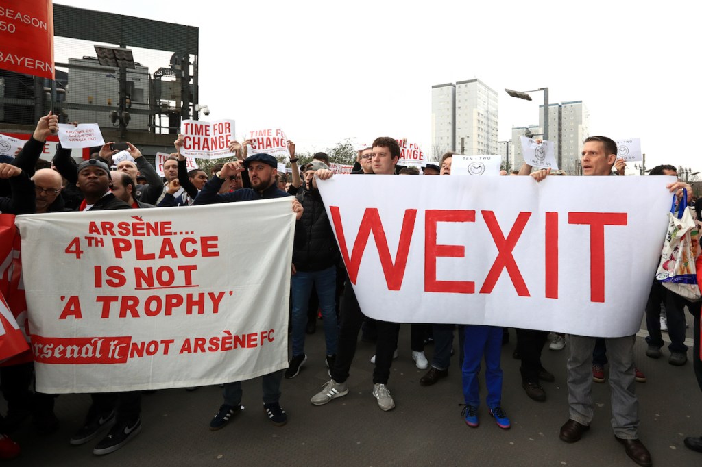 Misschien vind je dit een misplaatste vergelijking, maar de overeenkomsten tussen de Wenger Out-beweging en het Brexit-kamp zijn opmerkelijk. Voorafgaand aan Arsenals FA Cup-wedstrijd tegen Lincoln in maart was er een grote demonstratie tegen Wenger die bijgewoond werd door een paar honderd fans. Dat is natuurlijk slechts een fractie van de hele achterban, maar ze kregen wel de aandacht. Tussen de megafoons en protestsjaals viel één spandoek echt op. In rode letters stond er ‘Wexit’ opgekalkt.