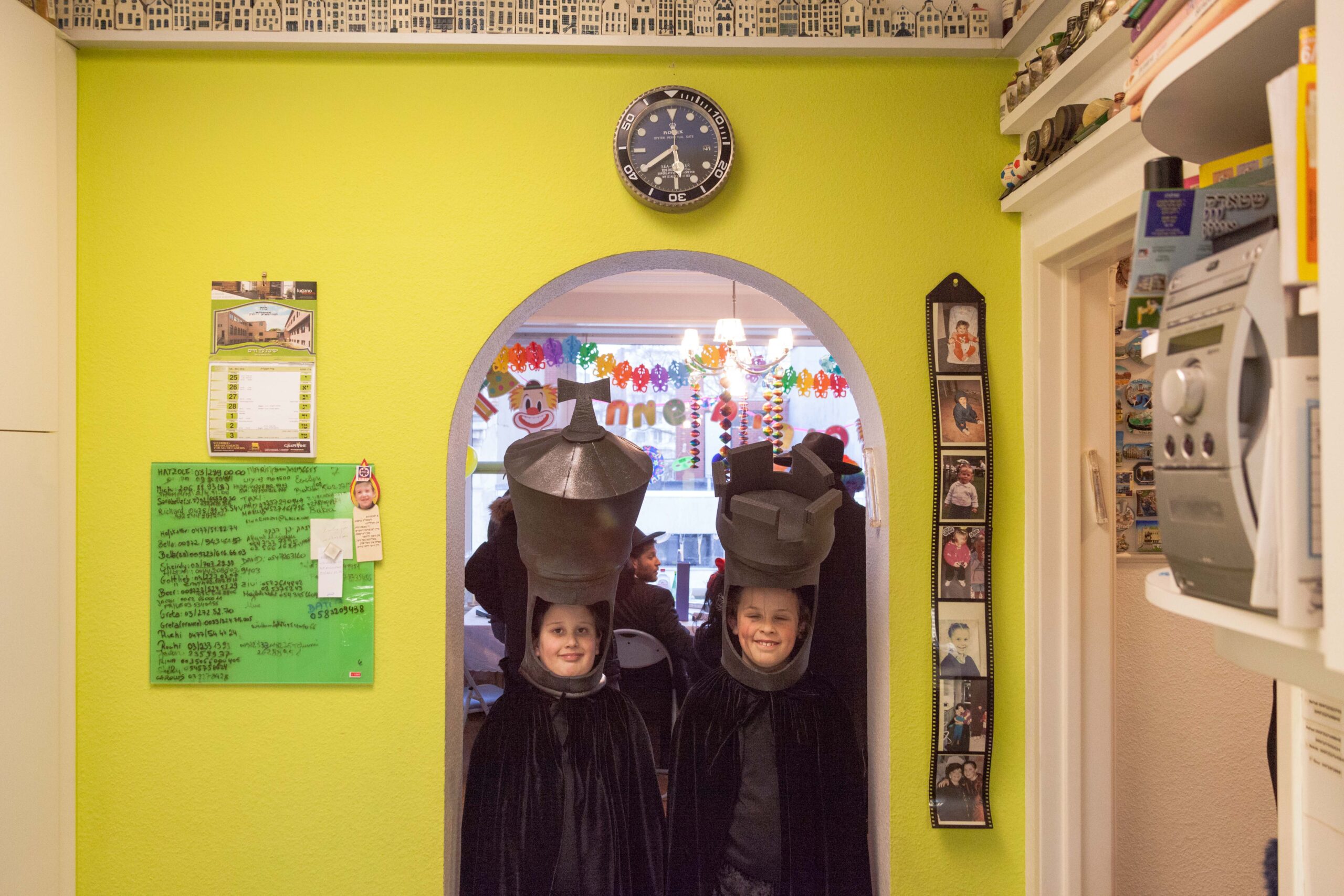 “Kom binnen, kom binnen!” roepen drie Joodse moeders ons toe. Het huis van Moshe* aan de Charlottalei lijkt op een soort Home Alone familiehuis, vol foto’s van huwelijken aan de muur, met een tafel gedekt voor veertig man, een riante boekenkast met tora’s en muren vol vakantiefoto’s in Jeruzalem. Lars, de fotograaf, neemt plaats naast gastheer Moshe — als vrouw mag ik zelf niet naast de mannen zitten, die vandaag whisky drinken, geldbriefjes aan elkaar uitdelen alsof het snoep is en af en toe een dansje plegen in de living.