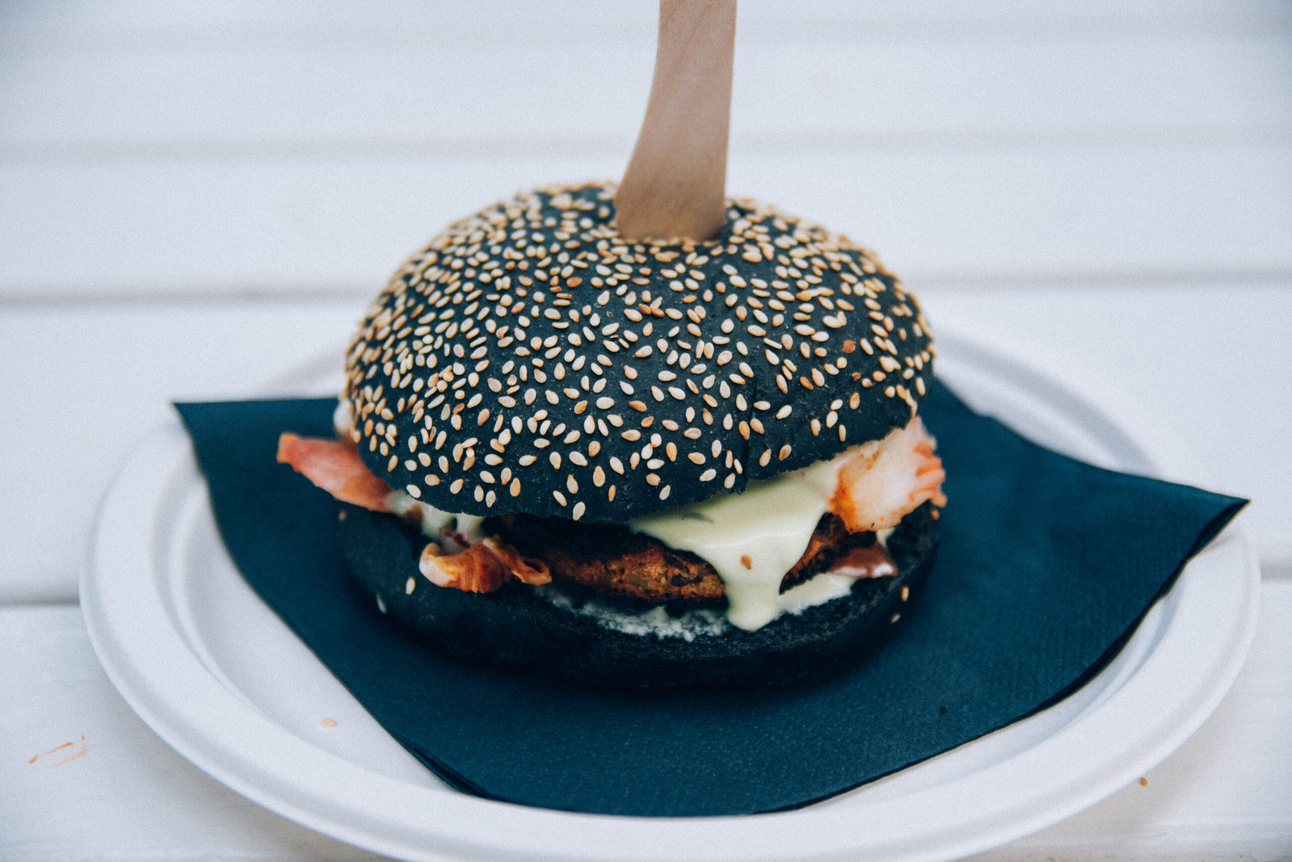 Mijn gretigheid neemt het van mijn ratio over en ik negeer dat er in mijn maag eigenlijk geen ruimte meer is. Dus eet ik opeenvolgend: een broodje vegashoarma (prima reepjes postbode-elastiek met shoarmamarinade), een hele kimchiburger (gitzwart, maar verrassend fris door de gefermenteerde Koreaanse kool), een zwartgeblakerde pompoen met geitenkaas (heerlijk, maar niet te eten zonder knoeien) en een bakje ijs met drie bolletjes: jasmijn-sinaasappel, mango-passievrucht en volgens de verkoper “iets wat lijkt op Marokkaanse thee.” Daarna besluit ik pas dat het genoeg is geweest voor vandaag.