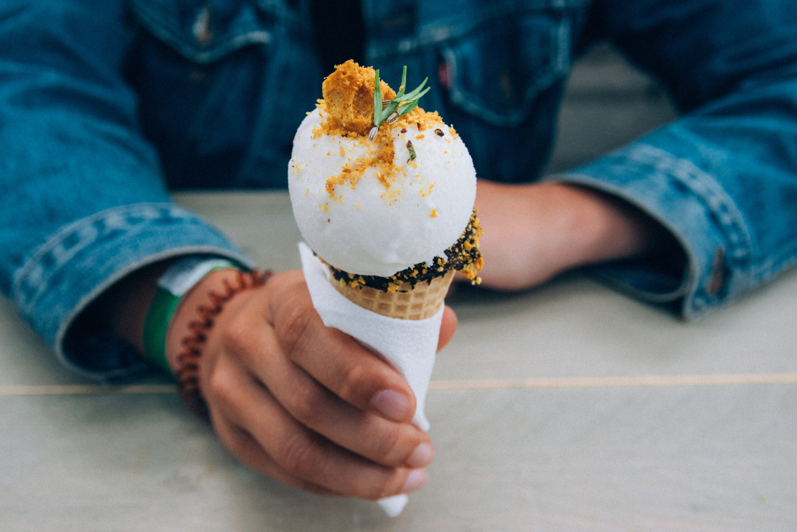 Een minuut later zitten we aan een wit tafeltje exact in het midden, waardoor het extra opvalt dat we he-le-maal alleen zitten. Het eten is gelukkig erg goed. Het is verfijnd en volledig plantaardig, maar de gerechten zitten bomvol smaak. We delen courgettebeignets en maistortilla’s met bloemkool. Als dessert krijgen we een hoorntje met een bol asperge-ijs, bestrooit met honeycomb. De smaak is ~bijzonder~, maar ik weet niet of ik er heel enthousiast over ben. Ik krijg ook niet echt de kans om erachter te komen, want bij de eerste lik ligt de bol alweer op mijn broek. Veggie Festival 2, Ik 0.
