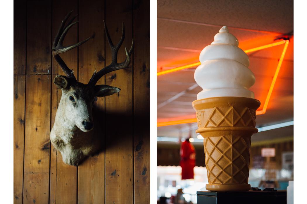 ’s Nachts op de parkeerplaats van Twede’s Cafe in het stadje North BendLinks: Buste van een bok in de Kiana Lodge in Poulsbo. Rechts: Model van een ijsje in Twede’s Cafe, dat in de serie Double R Diner wasDe locatie waar het in plastic verpakte lichaam van Laura Palmer in de eerste aflevering werd gevonden. Ze filmden het in 1989 en het houtblok is er nog steeds