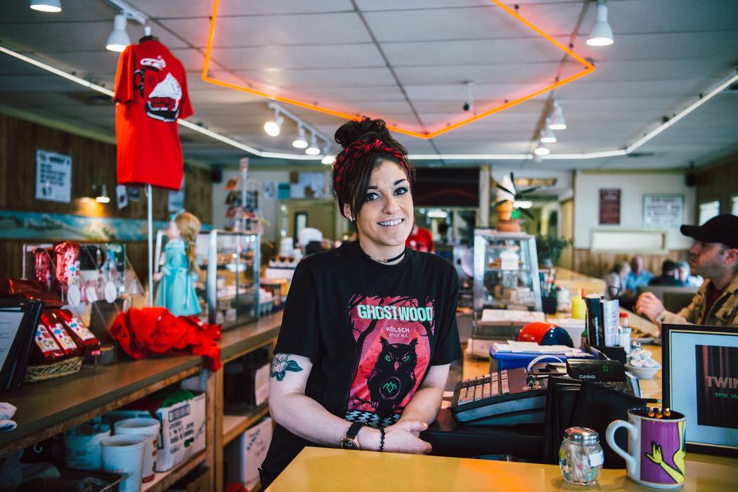 De bar van Twede’sNichole werkt bij Twede’s en zegt dat er elke dag fans langskomenLinks: Cyndi, die hier vier jaar geleden vanuit Las Vegas naartoe verhuisde en nu bij Twede’s werkt. Rechts: Iemand heeft “Cooper is a babe” op de Reinig Bridge geschreven. Een van de locaties uit de serieMary Hütter, 41 jaar oud, aan het werk bij Compass, een fietswinkel in North Bend. Zij en haar vriendin Amber Sievers zijn megafans van de serie en maken de beroemde Red Room na voor het nieuwe seizoen