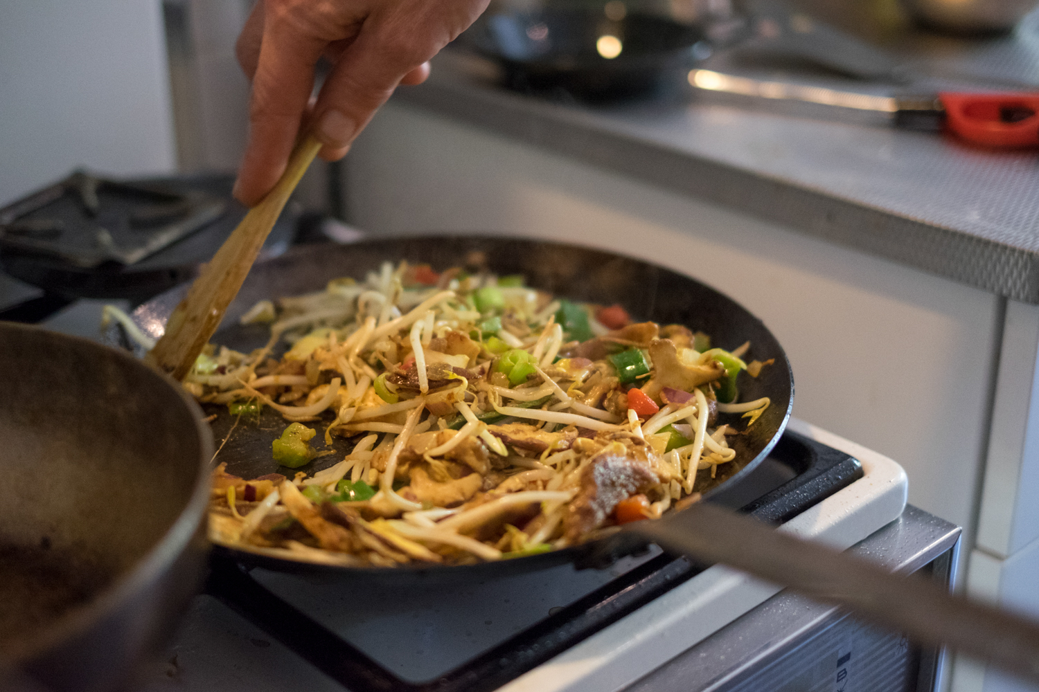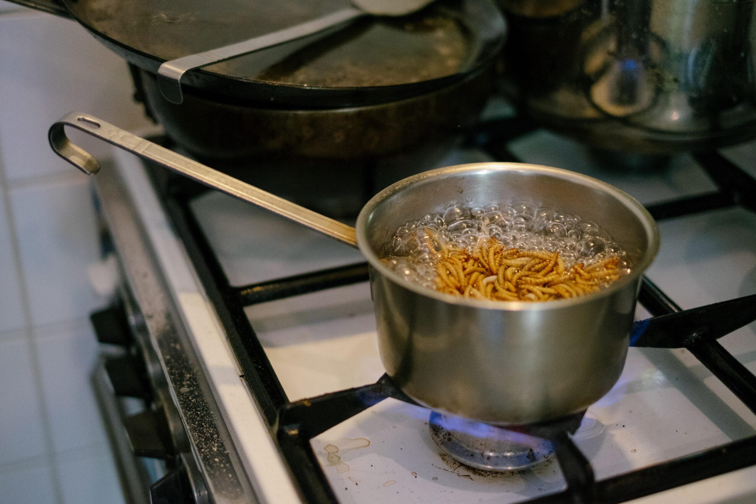 De meelwormen wassen we eerst. “Opletten, ze gaan ervandoor,” zegt mijn vader wanneer ik het vergiet even neerleg om alles uit te laten lekken. We hebben de wormen namelijk niet op de humane manier geoogst door ze in de vriezer te leggen, dus ze krioelen alle kanten op. Hij gooit de levende wormen in kokend water, waarmee hun lot bezegeld is. “Als je goed luistert hoor je ze gillen, net als kreeften,” zegt hij lachend om mijn zus op de kast te jagen. De basis voor de drie gerechten is hetzelfde: ui, paprika en meelwormen. Bij de roerbakschotel gaat kerrie, taugé en bami. De quiche maken we met peper, zout, ei, melk en wat nootmuskaat. Het pannenkoekje is belegd met de eerder gemaakte roerbakschotel, waar we wat shiitakes doorheen bakken.