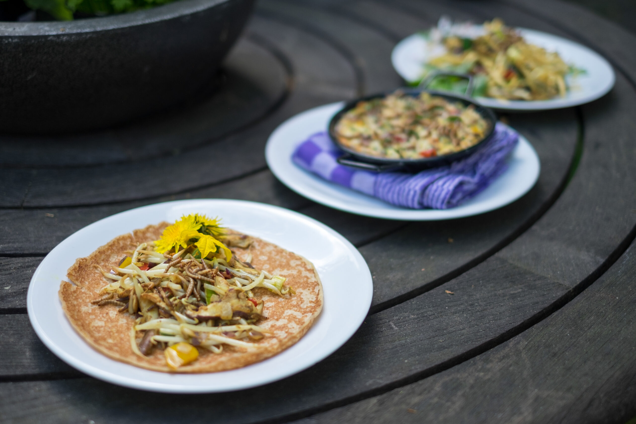 Als alles is bereid, legt mijn vader trots verse rucola en paardenbloemen uit de tuin op de met meelwormen verrijkte bordjes. Het ruikt inderdaad naar nootjes, zoals het internet me had verteld. De meelwormen zijn knapperig en gaan goed samen met zowel de roerbakschotel als de shiitakes op de pannekoek. Met de quiche heb ik meer moeite, want hier proef ik zachte, vochtige wormen, in tegenstelling tot de knapperigheid van de wormen in de andere twee gerechten. Ik word een beetje misselijk bij het idee van ei en wormen in mijn mond. De melk zorgt voor een vettig mondgevoel, en de wormen maken het echt niet beter. Ik probeer mijn gedachten te verzetten door mijn focus te verleggen naar mijn tafelgenoten.