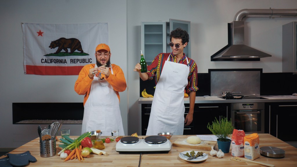 Caballero: We hebben weleens spacecake of spacekoekjes gemaakt en zo, maar nog nooit op dit niveau! De allereerste keer was voor deze show. Maar om eerlijk te zijn, in de video zie je twee handen het echte kookwerk doen hé. Dat is die Franse chef! Hij is ons komen helpen. We zijn niet supergoed in koken, maar we zijn wel sfeermakers. Die kok is het brein, wij zijn de gezichten. Wat je ons ziet eten in de afleveringen, dat eten we voor camera voor de eerste keer. Dat is best vet, je ziet direct wat we van het gerecht vinden. Die pizza was bijvoorbeeld perfect: knapperige korst, druipende kaas, schitterend in z’n eenvoud. En die milkshake was de perfecte frisse afsluiter daarvan.