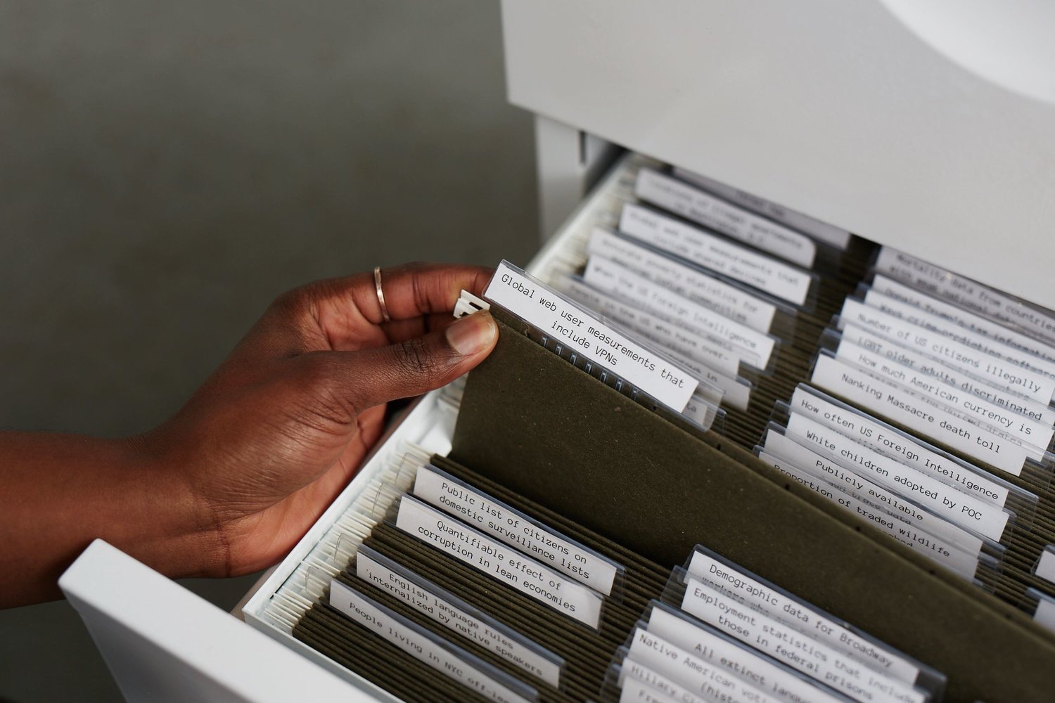 De gegevens die Onuoha daadwerkelijk ‘verzamelt’ in de lades van de bibliotheek, The Library of Missing Datasets, bestaan uit lege mapjes waarop de naam van de verzameling staat. “Het kunstproject is vooral een manier om iets abstracts als data concreet te maken. En om mensen na te laten denken over welke data er in hun eigen leven zou kunnen ontbreken, en waar dat door komt.”