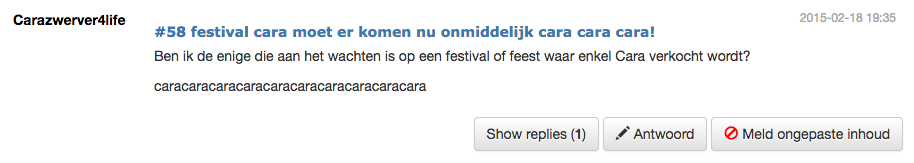 Er werd fanatiek getweet, een petitie werd getekend, het originele blik werd op t-shirts gedrukt, en in Gent werd een optocht gehouden met een afterparty in Antwerpen (onder de zeer toepasselijke naam: ‘I’m in love with the Cara’) waar uiteraard alleen maar Cara gedronken werd.