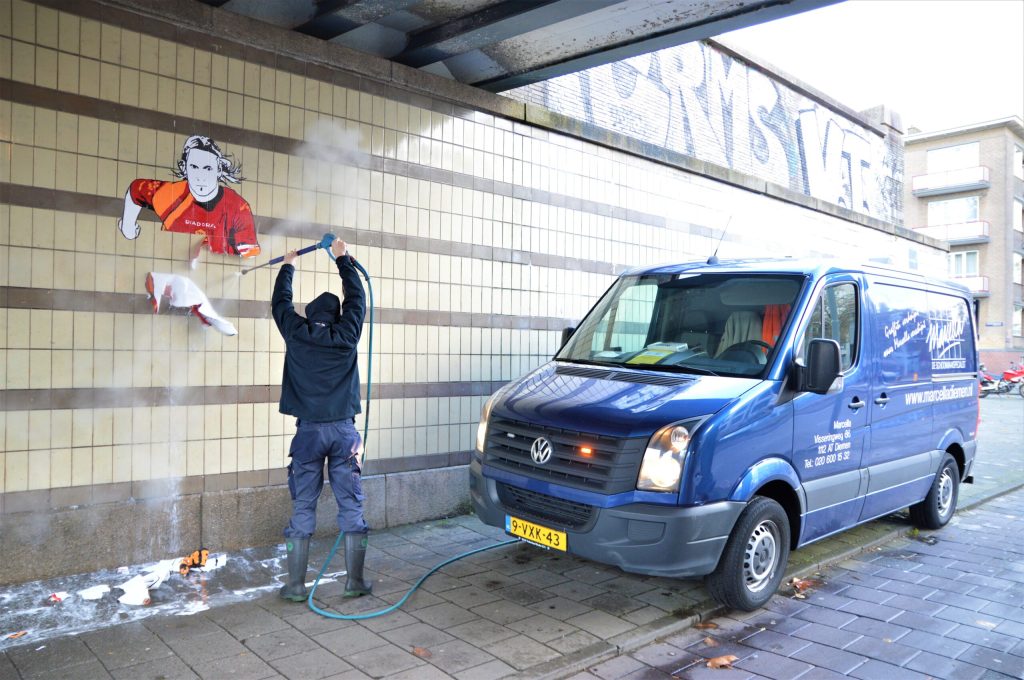 Het kunstcollectief Kamp Seedorf is anoniem, maar de kern bestaat uit drie leden. Je kent ze misschien van bakjes kibbeling, Vader Abraham met een gouden ketting of hun kunstwerk van Eberhard van der Laan, dat in maart door een GVB-medewerker werd verwijderd. Eus van Kamp Seedorf vertelt me dat ze afgelopen vrijdag hun twee meter hoge Totti nog maar net op Instagram konden zetten. Terwijl een van hen de foto maakte – de anderen zaten te wachten in hun busje – kwam er al een busje aanrijden met de legendarische slogan “Graffiti verdwijnt waar Marcella verschijnt”. En zo spoot Marcella de Schoonmaakspecialist in één luttele minuut ongeveer anderhalve dag werk aan gort. “Dat was wel zuur,” lacht Eus. “Zoiets hebben we nog nooit meegemaakt.”