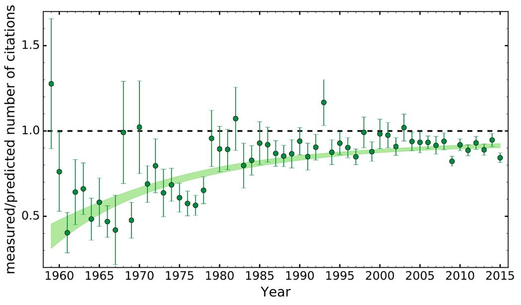 Gráfico apresentando as citações a mulheres em periódicos de astronomia ao longo do tempo. Crédito: Neven Caplar/Sandro Tacchella/Simon Birrer.