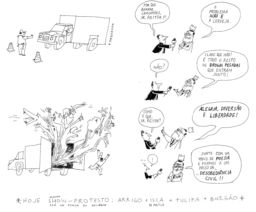 A Calourada Anual da USP tava marcada pra quarta-feira passada. Só que como o clima anda meio estranho por lá, uma hora pareceu que a festa não ia mais acontecer. O anúncio era de que o pessoal ia aproveitar os shows pra dar uma protestadinha, daí o Rodas quase rodou com o evento. Tentaram vetar a cerveja da galera, a entrada dos banheiros químicos foi embaçada e boatos sobre ações da PM começaram a se espalhar. Teve gente indo pra Praça do Relógio receosa. Só que apesar disso tudo e uma ocorrência no dia anterior, o portão principal ficou lá de grades abertas pra qualquer um, contribuinte ou inadimplente, curtir a Cidade Universitária. Até as 20h, sem qualquer tipo de revista. Depois, só acompanhado por estudante com carteirinha ou dentro de um ônibus comum, sem problema, estilo KGB sem verba. E no final das contas tudo rolou tranquilo. Teve até fila de táxi no final, que bateu lá pelas 4h e tanto. Tomei minhas cervejinhas e conheci bon vivants que estavam lá exercendo o direito à fanfarra. Se liga nas maravilhas: