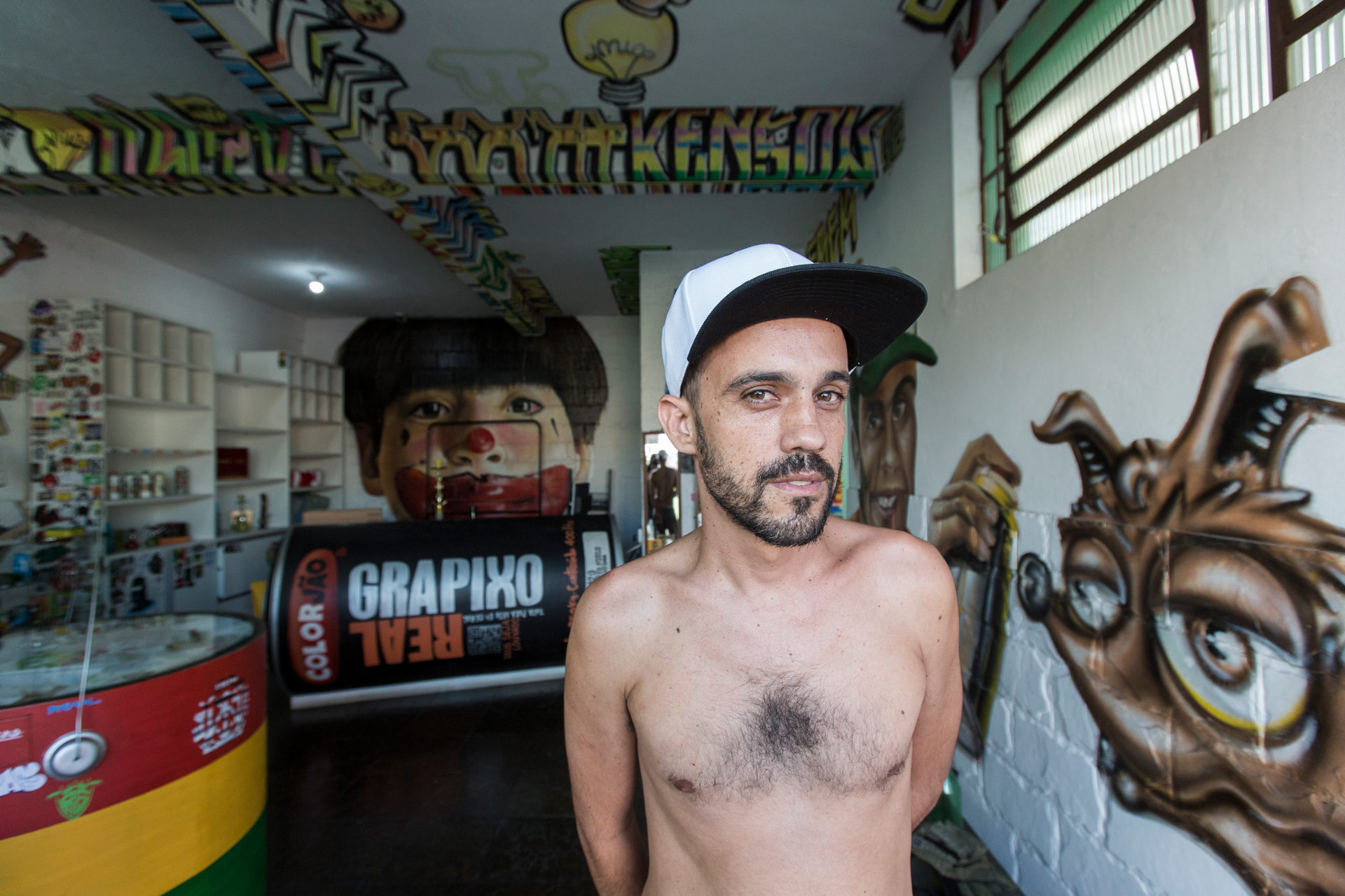 Eles falaram: “tá vendo essas camisas [da loja do Goma] com folha de maconha, com letra pixação? Se você não entregar agora nós vamos te levar por apologia e ainda vamos te envolver no caso”. Comentei da decisão do STF, falei: “te mostro ali que, pela lei, isso não é apologia”. Falaram: “mas é só pra te foder mesmo”. Aí eu peguei as camisetas e falei: “pode me levar, então, que eu não vou caguetar ninguém”. Me levaram preso, mas o Felipe [advogado] foi lá e me tirou na hora. Depois, o Frek foi intimado e nós demos ideia no Maru para ele se entregar. Passaram uns dias e pularam na casa dele, na do Frek e aqui na loja. Nesse dia, só prenderam o Maru, mas levaram tudo da loja, todas as roupas. Até a blusa que eu estava vestindo me mandaram tirar. Depois disso, passaram 28 dias e eles voltaram e me prenderam, de manhãzinha.