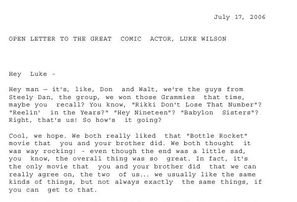 Não é só a galera do hip hop que bebe nessa fonte. Se você busca uma introdução curta ao humor da dupla, saca só essa carta aberta escrita para Luke Wilson, após seu irmão Owen ter “emprestado” a narrativa de “Cousin Dupree“, lançada pelo Steely Dan em 2000 para servir de enredo para seu filme de 2006, Dois É Bom, Três É Demais. Abaixo temos um trecho da carta, mas vale ler na íntegra, de verdade.