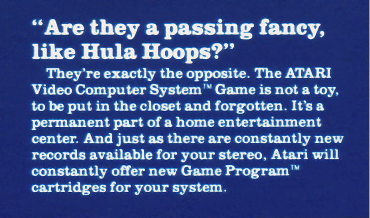 O texto diz: “‘É uma tendência passageira, como o bambolê?’ É exatamente o oposto. O ATARI não é um brinquedo para ser colocado no armário e esquecido. É uma parte permanente do centro de entretenimento de uma casa. E assim como constantemente existem novos discos disponíveis para o seu som, o Atari irá constantemente oferecer novos cartuchos para o seu sistema.” Imagem: Atari/Reprodução.