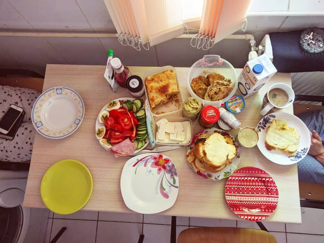 În perioadele când nu am mâncare de acasă sunt două alternative foarte bune. Prima e pachetul colegilor de palier, care mereu au ceva și pentru tine. A doua variantă este cantina unde mâncarea e bună și are prețuri decente.