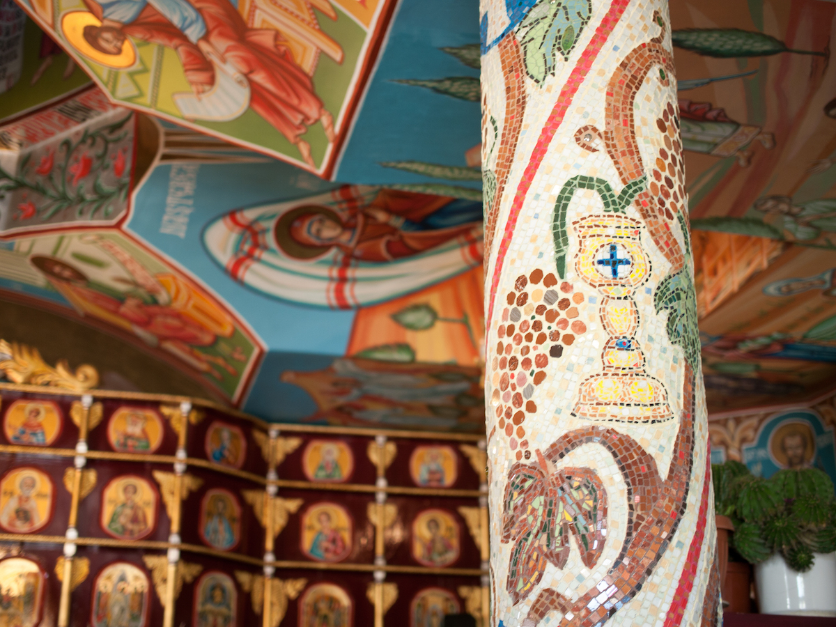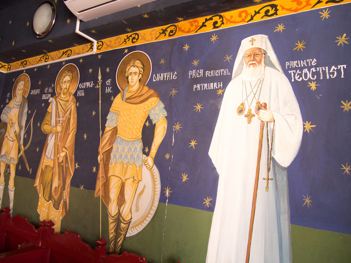 Biserica e mică și are o singură fereastră, protejată de gratiile care formează o cruce. Sfinții de pe pereți sunt pictați stângaci, în culori vii. Patriarhul Daniel zâmbește dintr-un tablou atârnat lângă gratiile ferestrei.