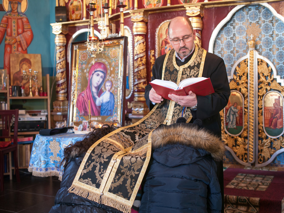 Claudia și Elena, la spovedania înainte de Sfintele Sărbători de Paști.