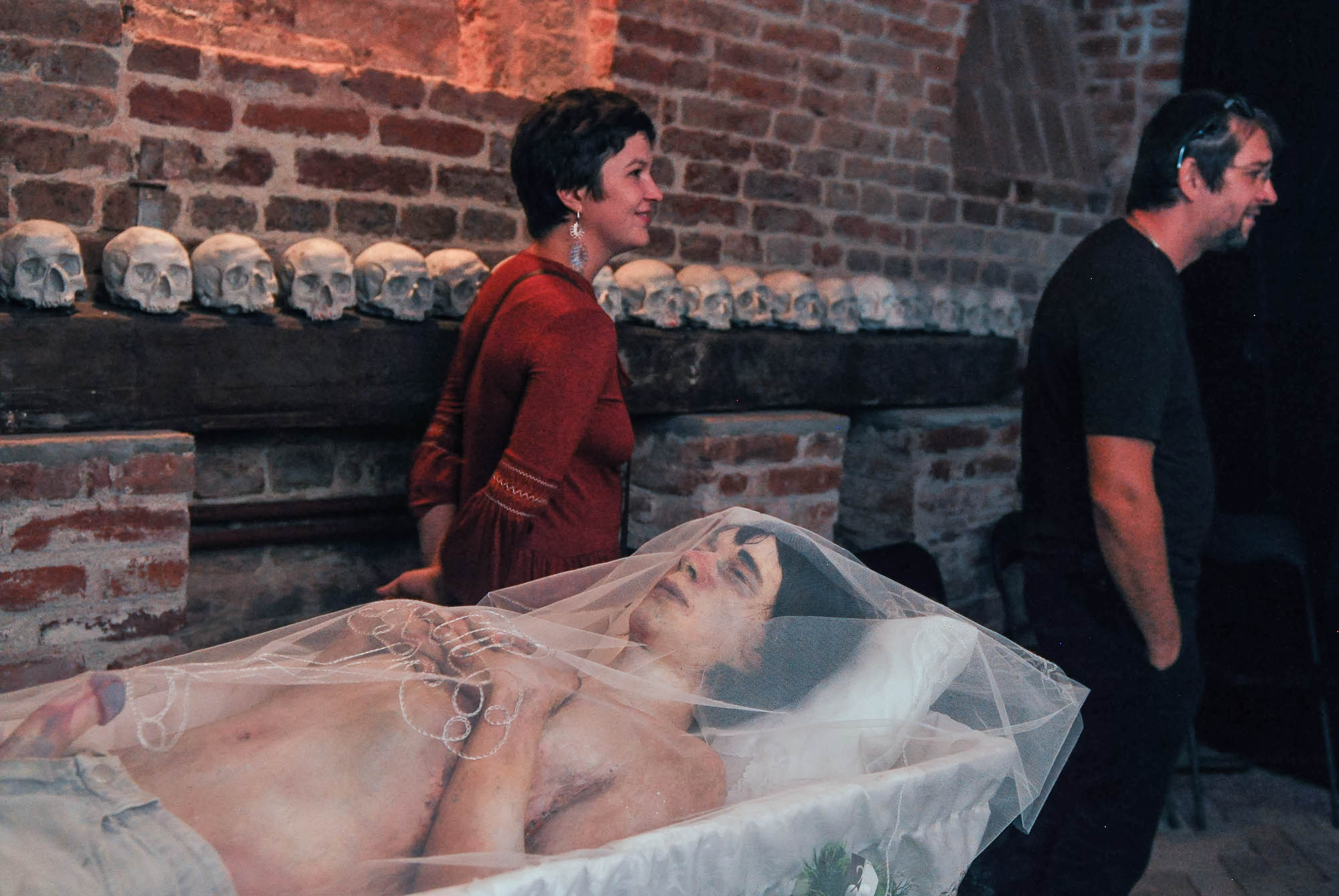Cobor în subsolul clădirii inaugurate în 1752, actualmente aflată în subordinea Ministerului Culturii. Pe un ecran, Mihai vorbește o limbă inventată, în timp ce pe unul din peretele opus un medic îi ia sânge, pe care acesta îl bea. La întâlnirea aberațiilor fonice, publicul pufnește în râs. Între ele e un pahar de vin roșu cu puțin reziduu sec pe fund.