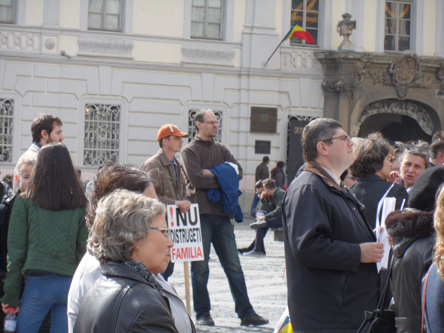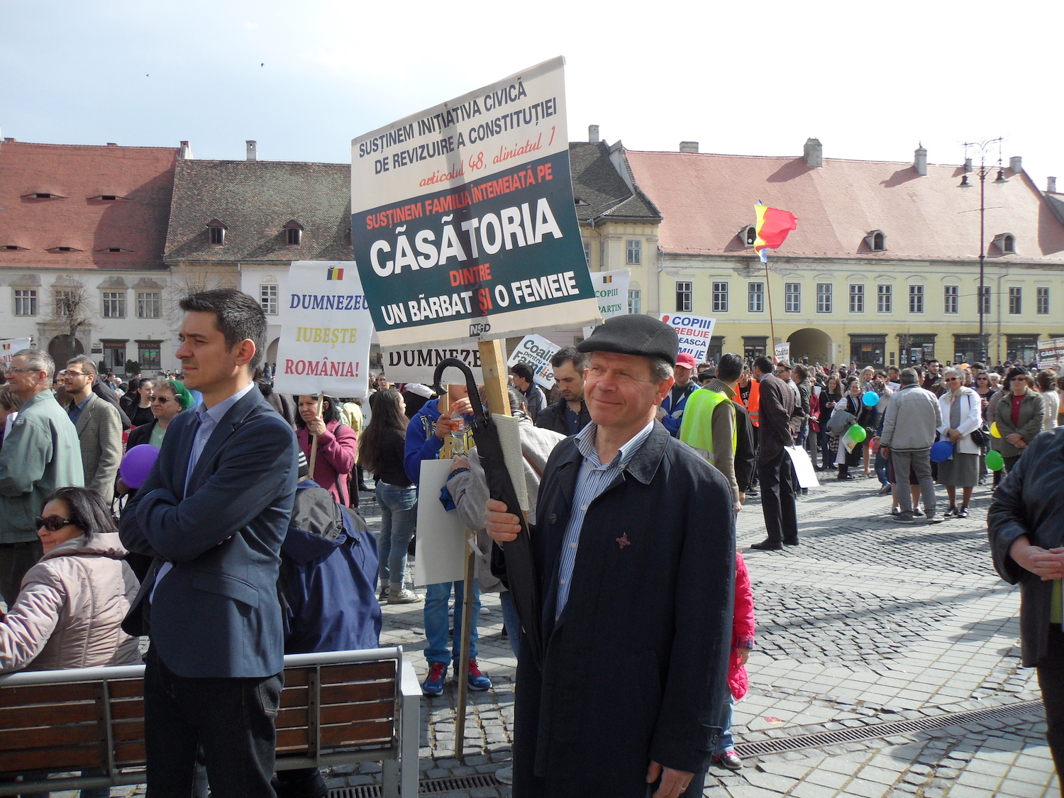 Au fost în jur de șapte sute de oameni la Sibiu. Îl aud pe unul dintre participanți: „Totuși suntem puțini”. Dar se consolează imediat singur: „Mi se pare mai bine”. Pancartele au venit într-o dubă. Un bărbat în rochie comandă de la microfon „împărțiți pancartele”. Și așa m-am ales și eu cu una. S-au spus câteva rugăciuni, pe fundal de baloane pocnite și oameni călcați constant de triciclete. Cum eu nu prea le știam, am trezit suspiciunea unui tânăr ortodox care mă fixa cu privirea. Parțial, motivul pentru care sunt aici e ca să mă uit după băieți sexy homofobi.