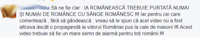 Ai înțeles, da? Ia nu poate fi purtată de orice româncă, ci doar de una cu sânge românesc. Pe lângă asta, adevăratul scop al clipului este unul mult mai grav, respectiv că masonii vor să ne umple de străini care să poarte iile noastre. Ce-i drept, nu am mai auzit de mult de conspirații cu masonii care vor să fure România.